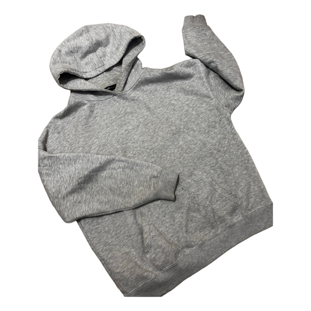 Grey long-sleeved hooded sweatshirt with a front pocket.