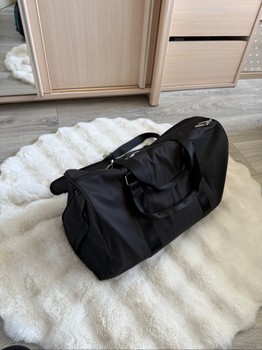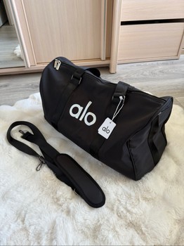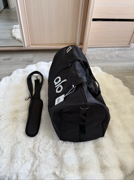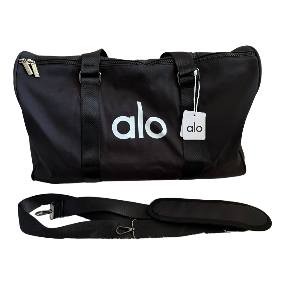 Black sports duffel bag with white Alo logo. Includes a detachable shoulder strap and features interior lining with branding. New with tags.