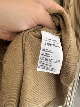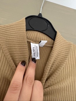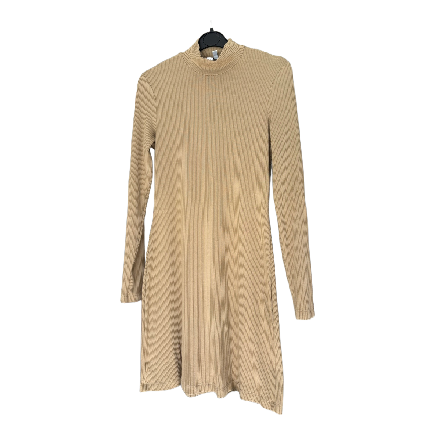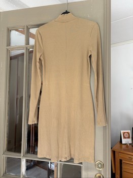 & Other Stories in beige/camel-colored mini-length dress. Mid-high turtleneck/mock neck, full-length sleeves. Not completely skin-tight fit, hem widens a little. Size 36. Good condition, no complaints.