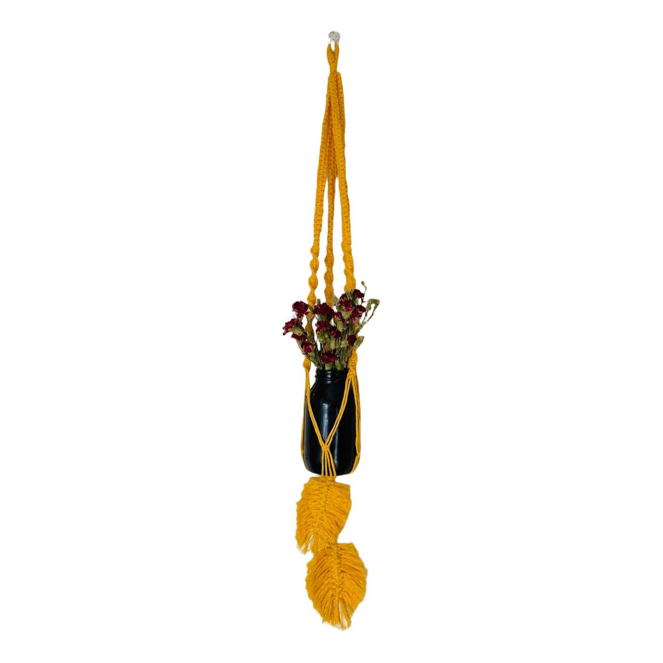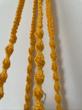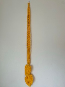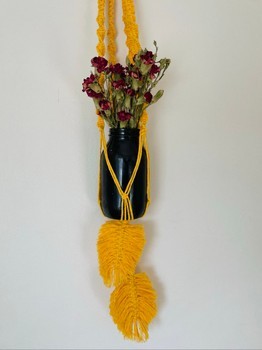 Yellow hand-tied macrame plant hanger. Fits a 14 cm wide flower pot, or a smaller one. Also looks nice with, for example, a vase/glass jar! Material 80% recycled cotton 20% polyester. Glass jar and flowers are only photo props, are not included in the sale!