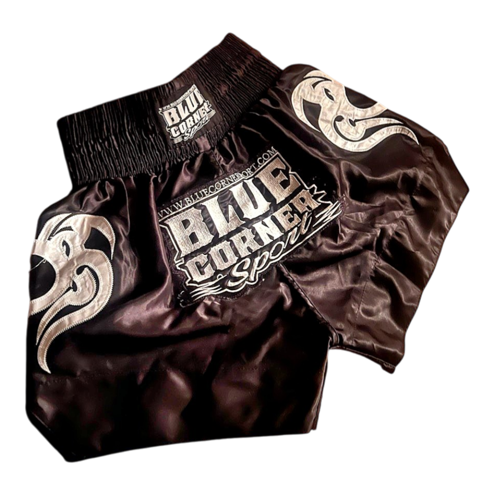 Black satin boxing shorts with a wide elastic waistband and white tribal-style graphics. Brand name Blue Corner Sport is on the waistband.