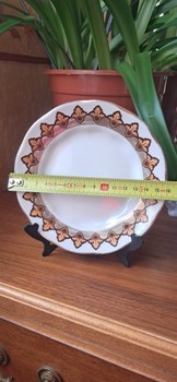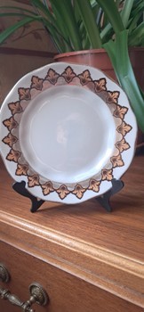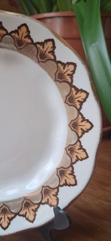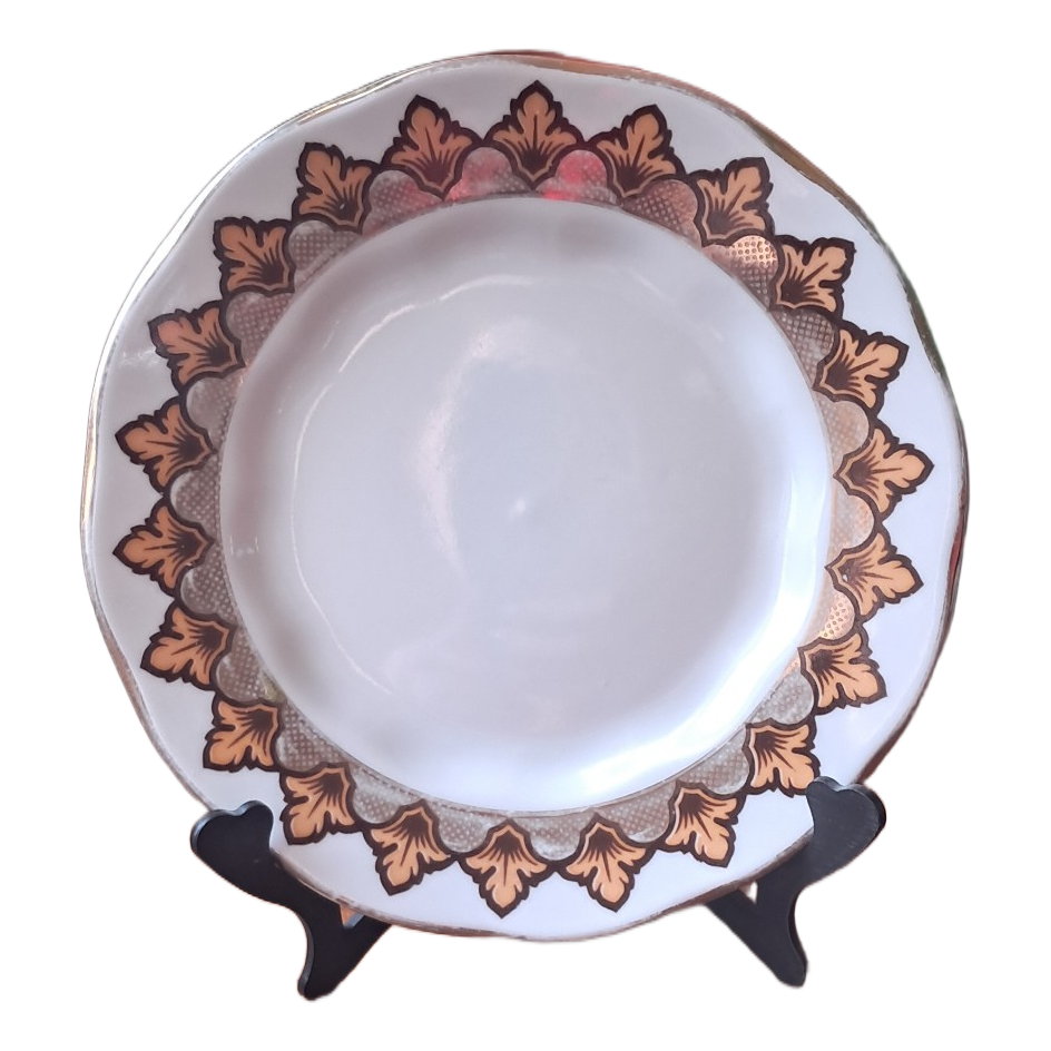 White ceramic decorative plate with gold leaf pattern border. Diameter is approximately 15 cm.