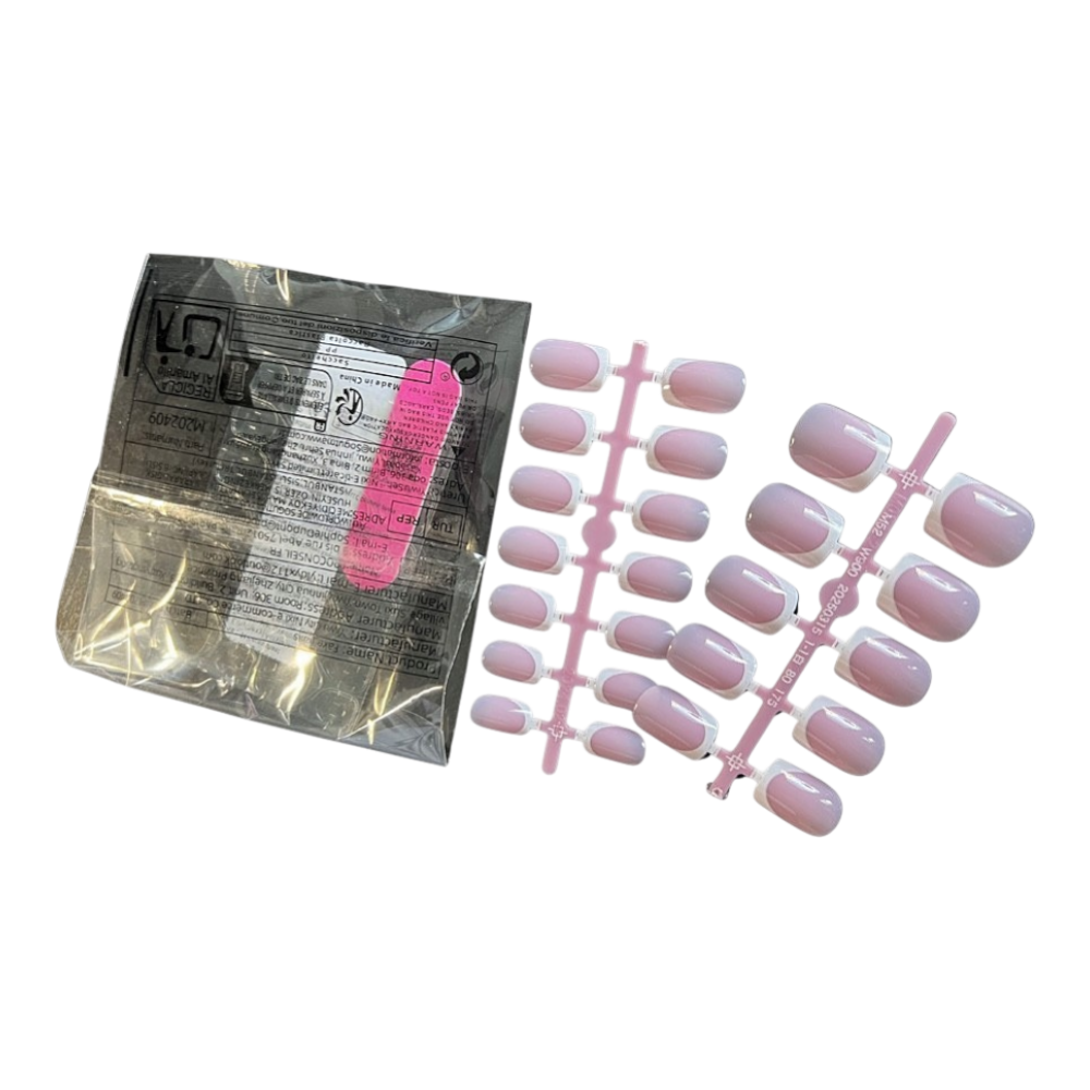 Set of pink artificial nails with white tips. Comes in various sizes on a plastic tray.
