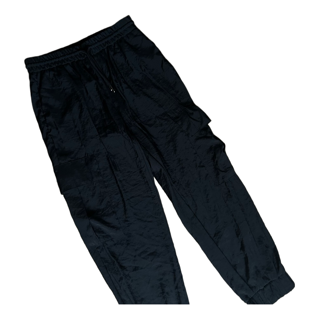Black cargo trousers with a drawstring waist and elasticated cuffs.