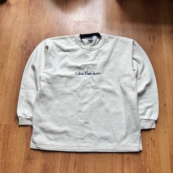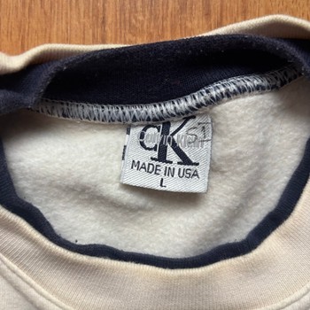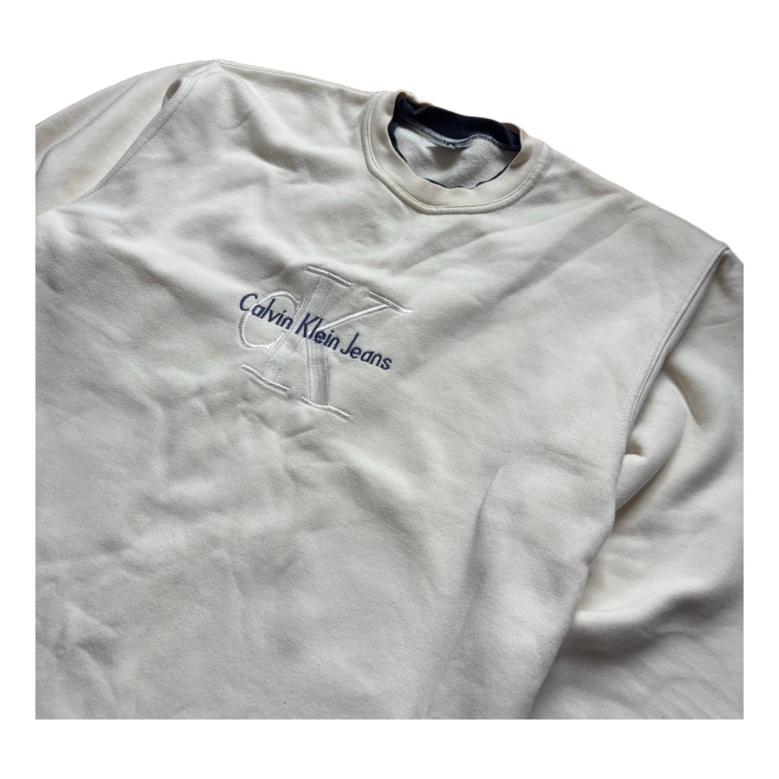 White long-sleeve sweatshirt with an embroidered logo on the front. Features a navy blue collar trim. Size L.