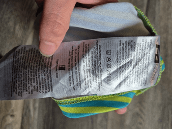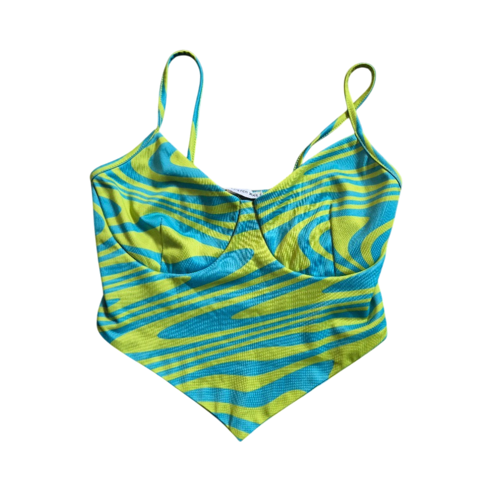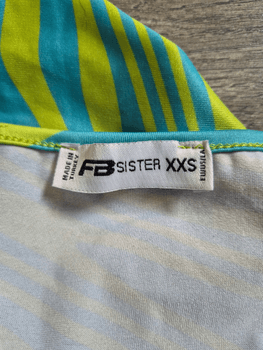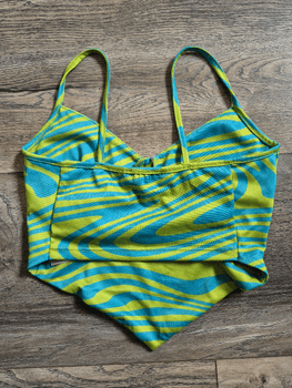 Turquoise-yellow top, size XXS. I think it corresponds more to size XS, stretches a bit. Never used. 95% polyester and 5% elastane.