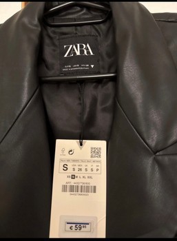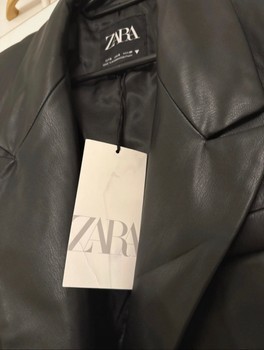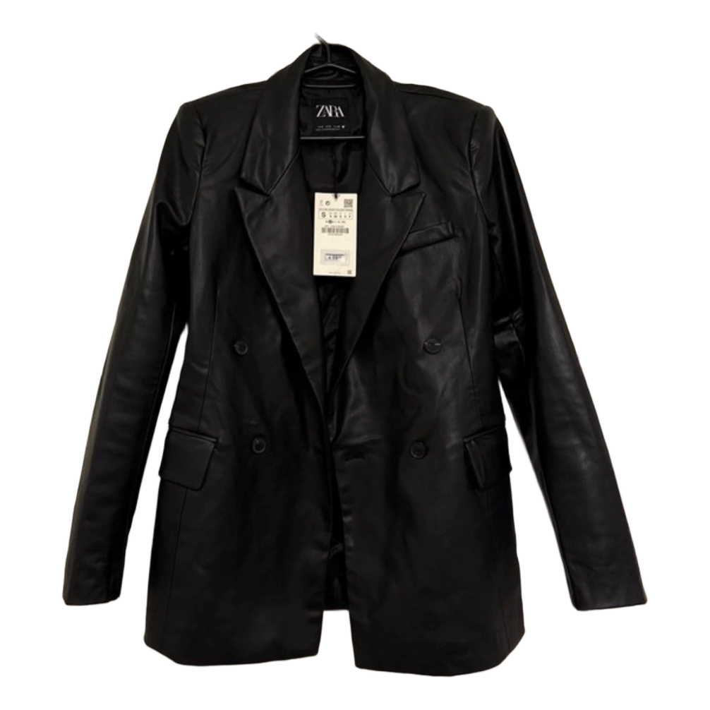 Black double-breasted faux leather blazer with a notched lapel and button closure. New with tags. Size S.