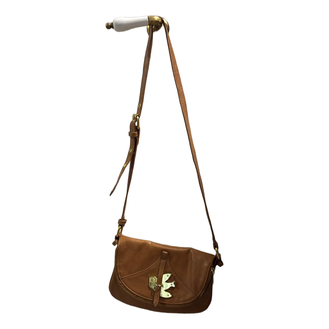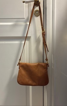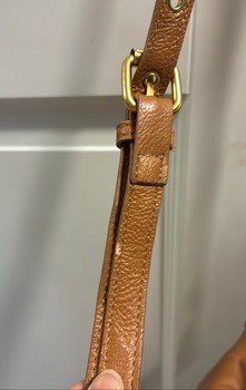 Brown shoulder bag with adjustable strap. Inside black-and-white logo patterned lining. Has signs of use.