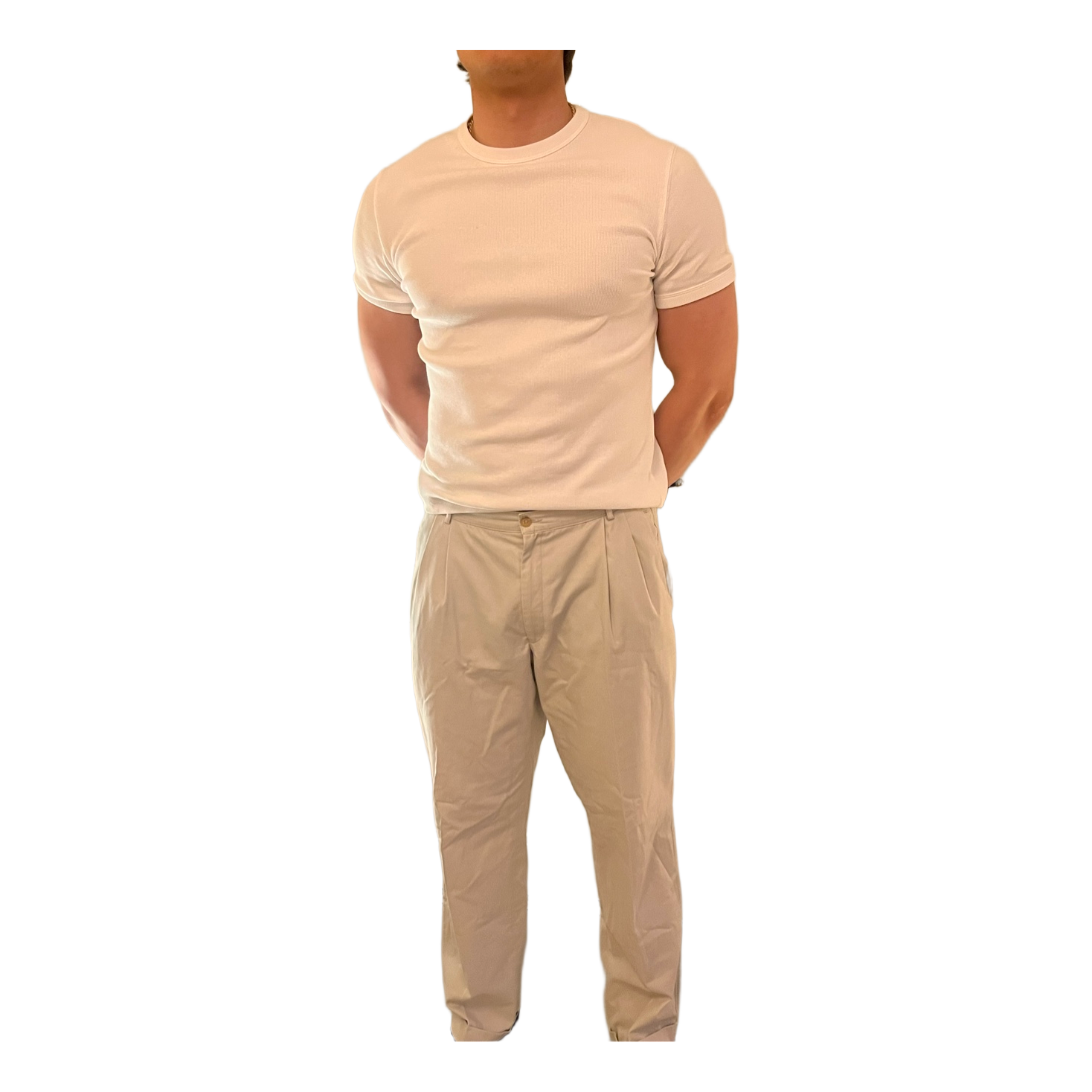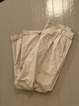 Beige, pleated men's trousers. The legs have turn-ups.