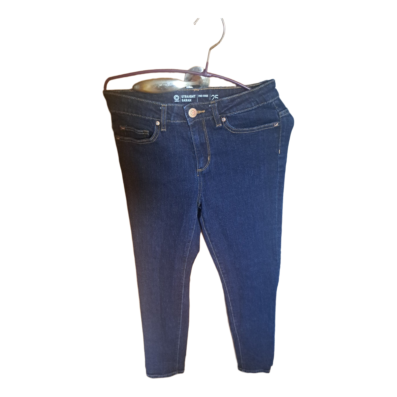 Dark blue denim jeans with a mid rise. Straight leg cut. Size 25