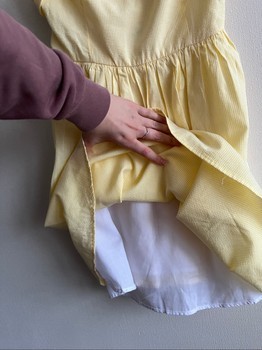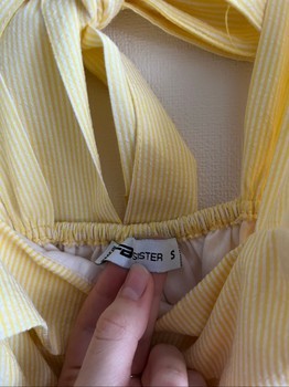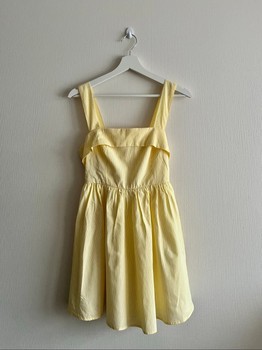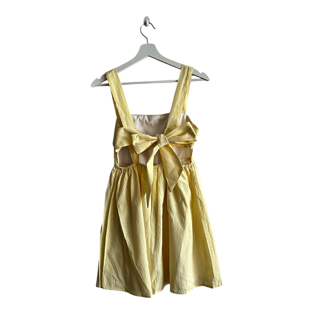 Yellow and white striped dress with a bow detail at the back and a white lining. Size S.