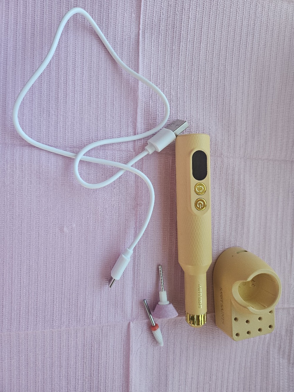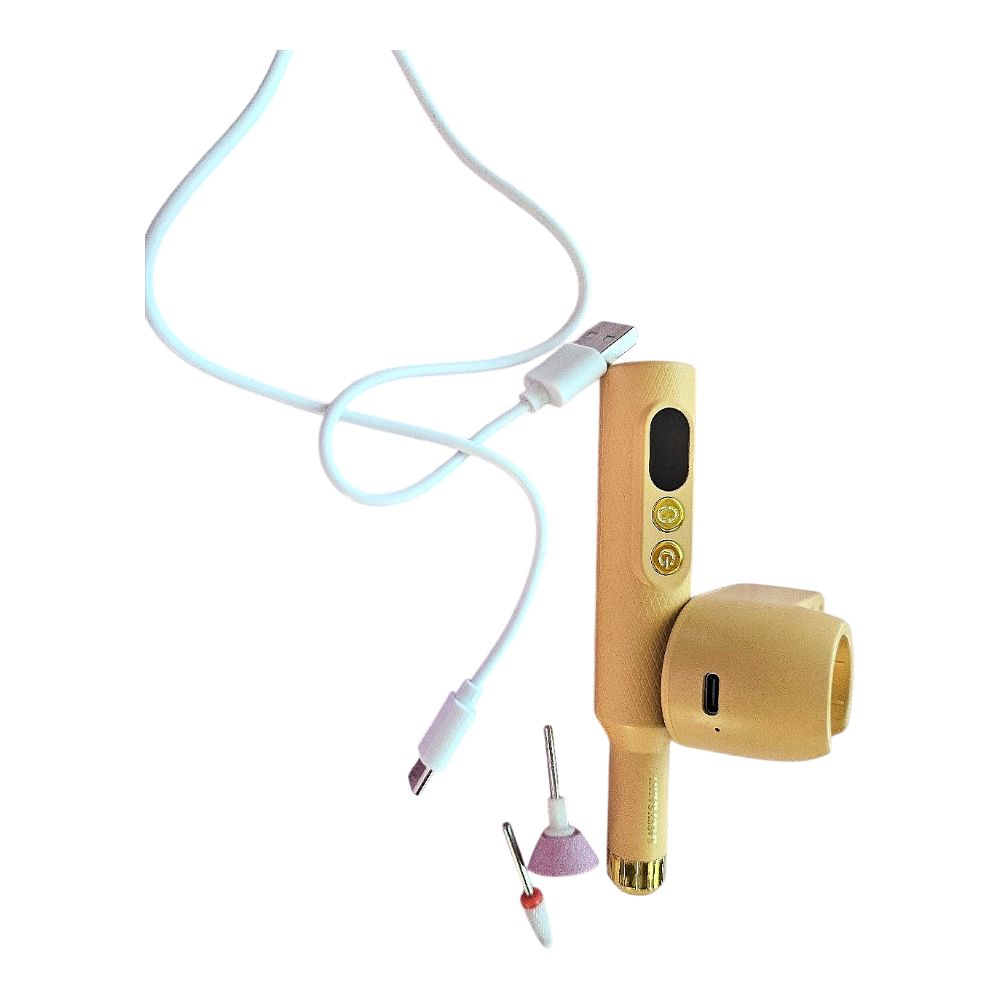 Portable electric nail drill set in apricot color. Includes a charging stand, USB cable, and two drill bits.