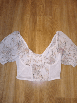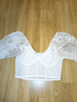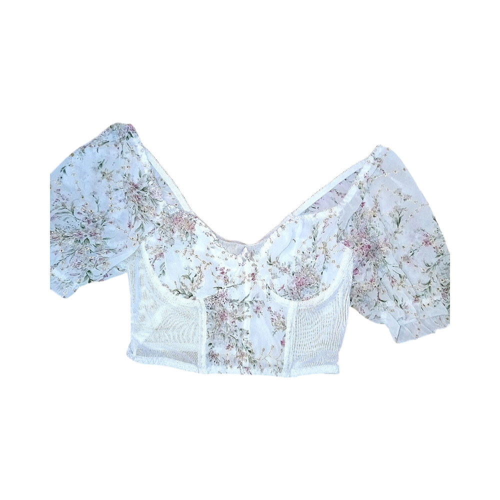 White short top with floral pattern and puff sleeves. Mesh details and embroidery. In person more ivory-colored