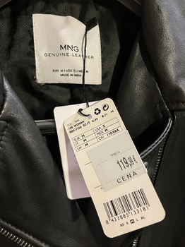 Jacket featuring a black color with a zip closure and multiple pockets. Made from genuine leather with an asymmetrical design.