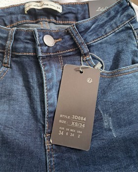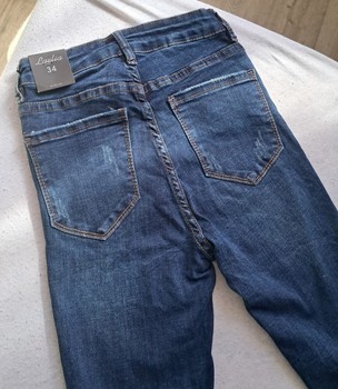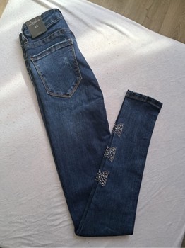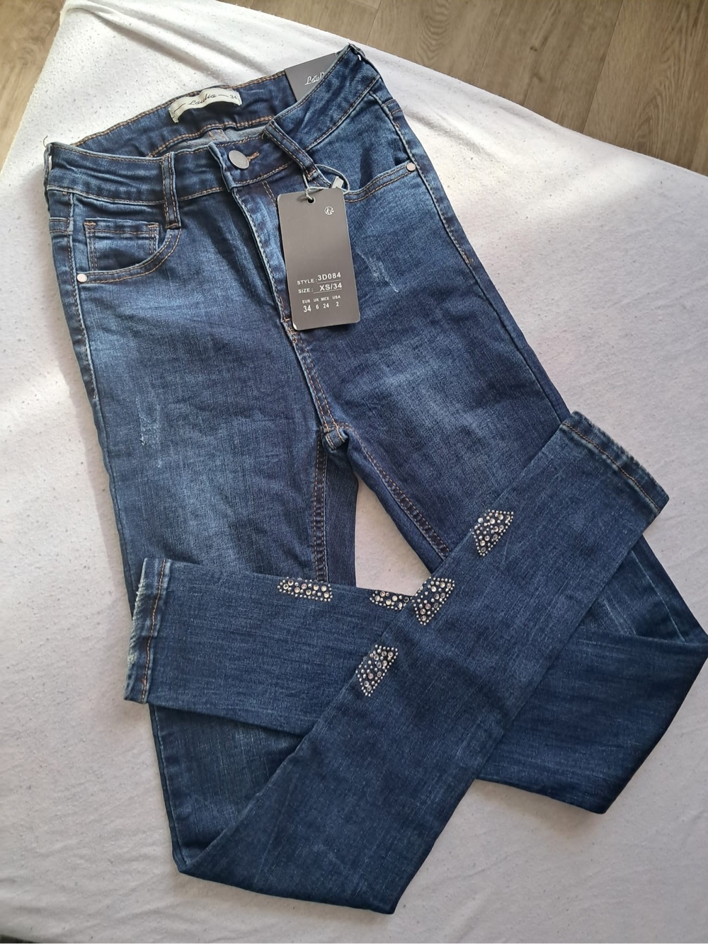Zilas džinsu bikses ar akmentiņu rotājumiem uz starām. Jaunas ar cenu zīmi. Izmērs 34.