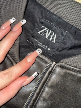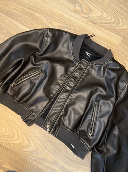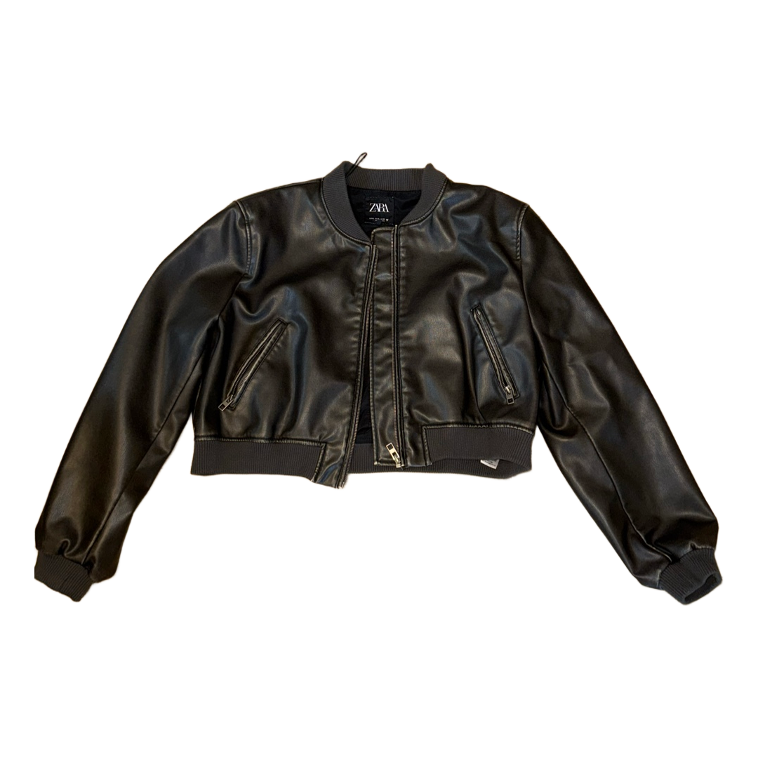Black faux leather cropped bomber jacket with ribbed cuffs and hem. Zip-up closure and side pockets. Size XL.