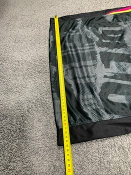 Black and grey patterned sports shirt with pink and yellow accents. Features a Nike swoosh and an emblem on the chest. The shirt has short sleeves and a V-neck.