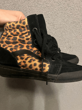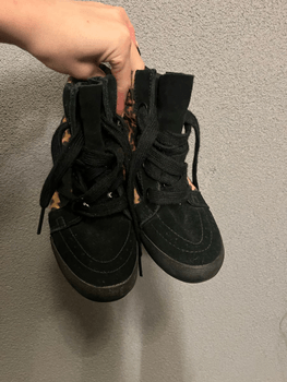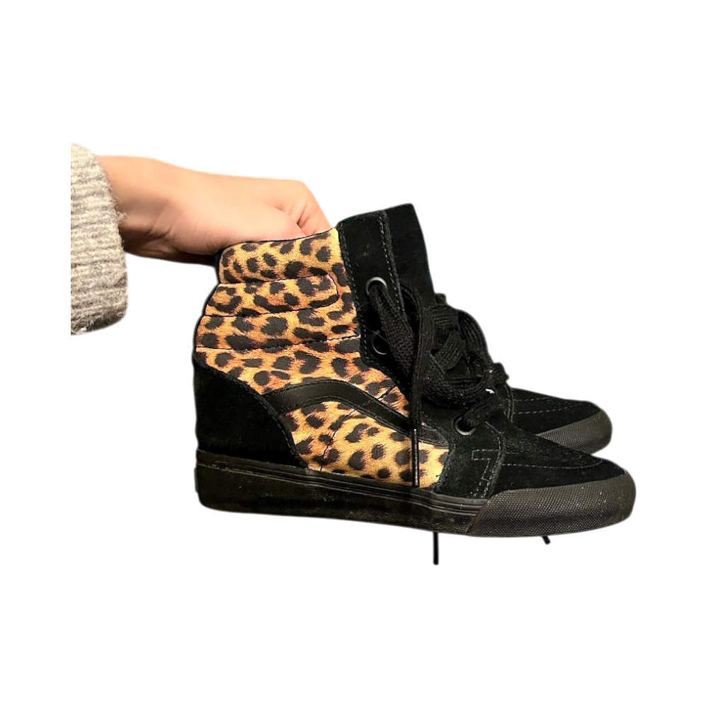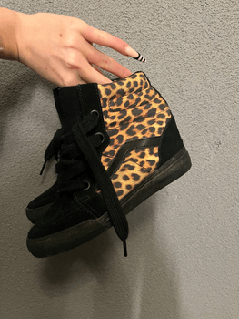 High-top black sneakers with leopard-print details. Lace and zipper fastening.