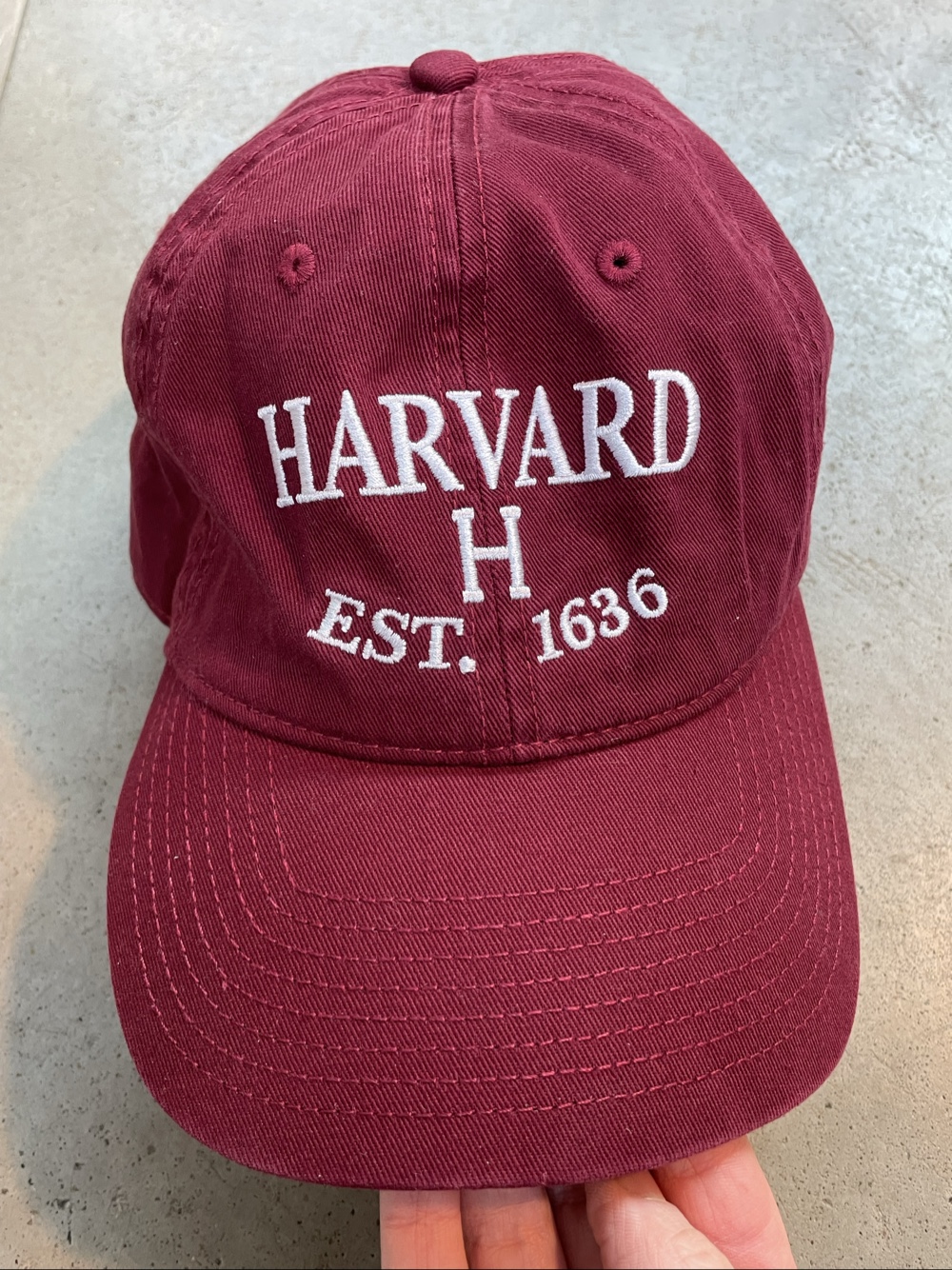 Burgundy cotton baseball cap with white Harvard embroidery.
