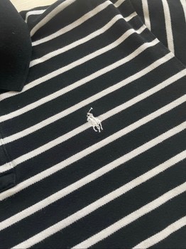 Black and white striped polo shirt with a buttoned collar and embroidered logo. Size XL.