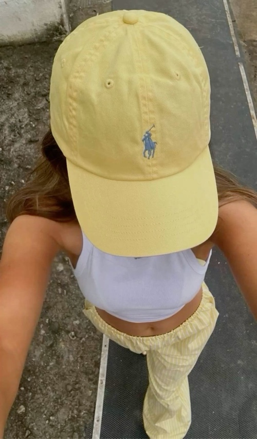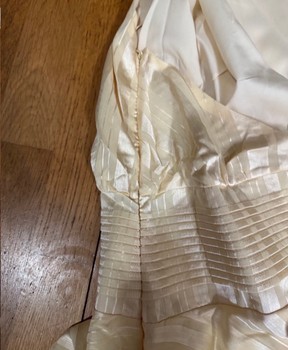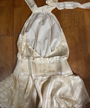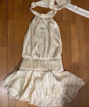 Short halter neck dress in a yellow striped fabric with a cinched waistband and ruffled skirt.