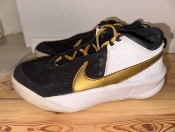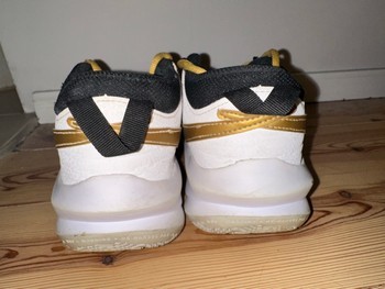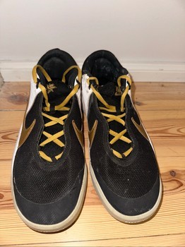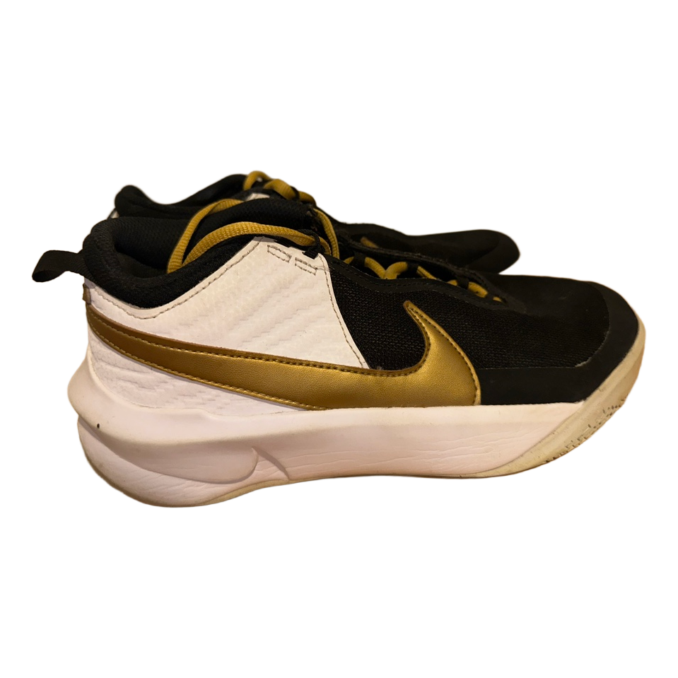 Black and white Nike basketball sneakers with gold details. Feature gold laces and a cushioned white sole.