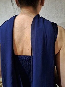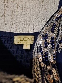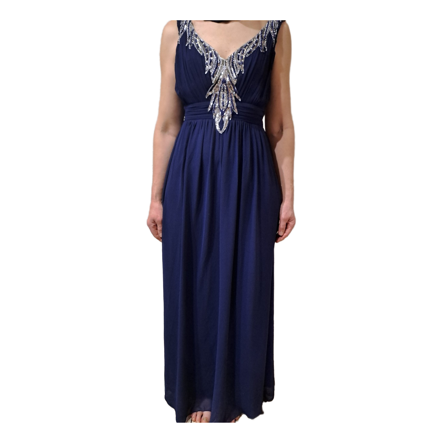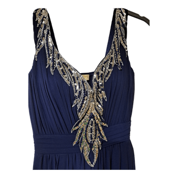Navy blue maxi dress with silver sequin and bead embellishment at the neckline. Features a smocked back panxel and flowing fabric. Size 8.