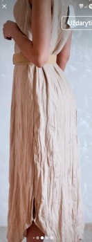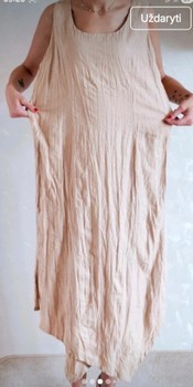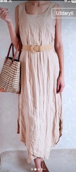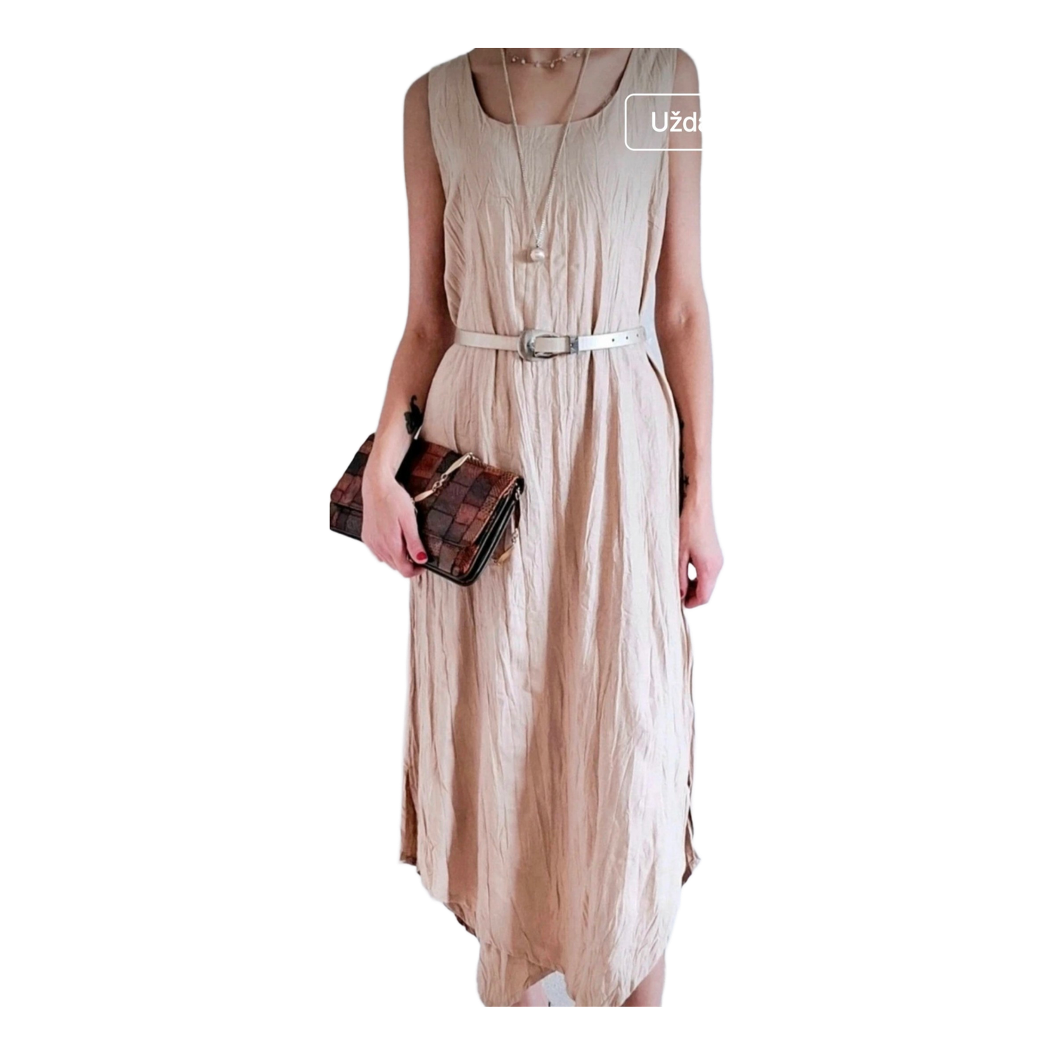 Beige sleeveless dress with a crinkled texture. Features side slits and a comfortable fit.