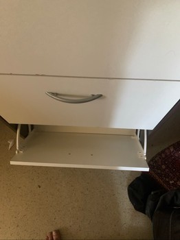 White shoe cabinet, with three opening tiers and brown top surface.