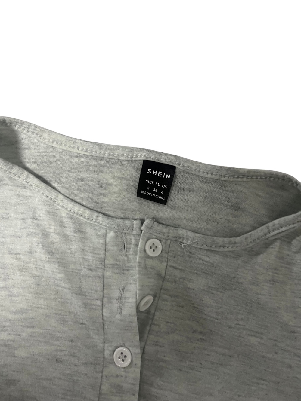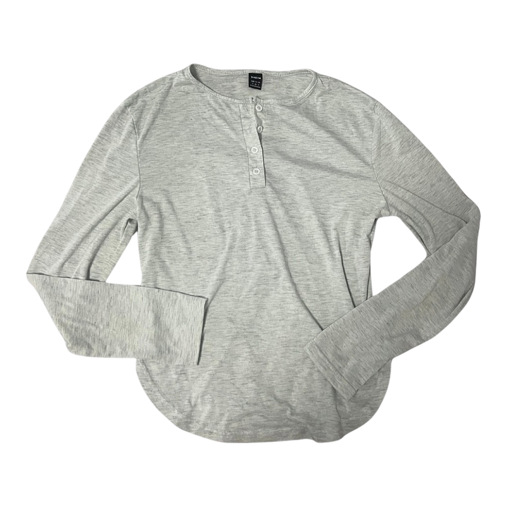 Grey long-sleeved top with a button-up placket at the neckline. Size S.