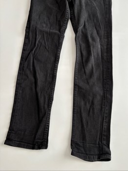 Men's black jeans. Pockets at front and back on both sides. Holes for a belt. Straight legs.