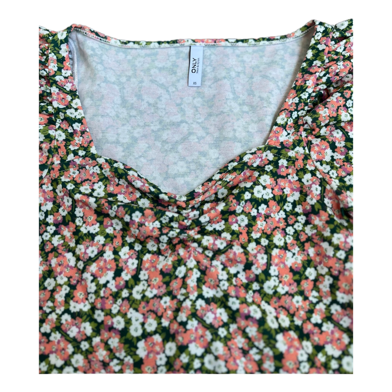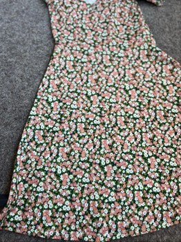 Like new, used once. Ruching at the chest and ruffle sleeves.