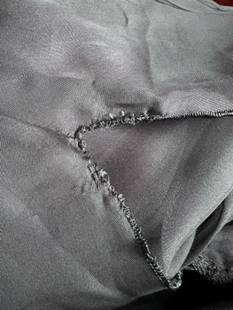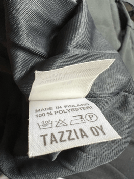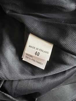 Tulip-shaped gorgeous layered chiffon skirt, size 40. Made in Finland. Outer fabric 100% polyester, lining 100% polyamide. Hand wash 30C. Wide 6cm waistband, on left side seam two buttons and a 20cm zipper. Waist width (note: not stretch) 38cm, length approx. 100cm. Otherwise neat and intact but at the hem on the side seams small approx. 3cm tears neatly and quite inconspicuously darned (see picture).