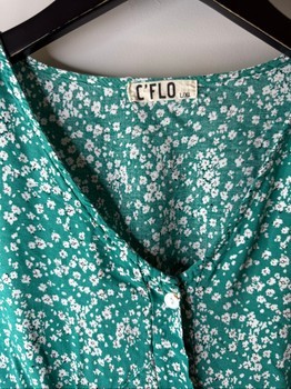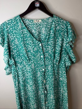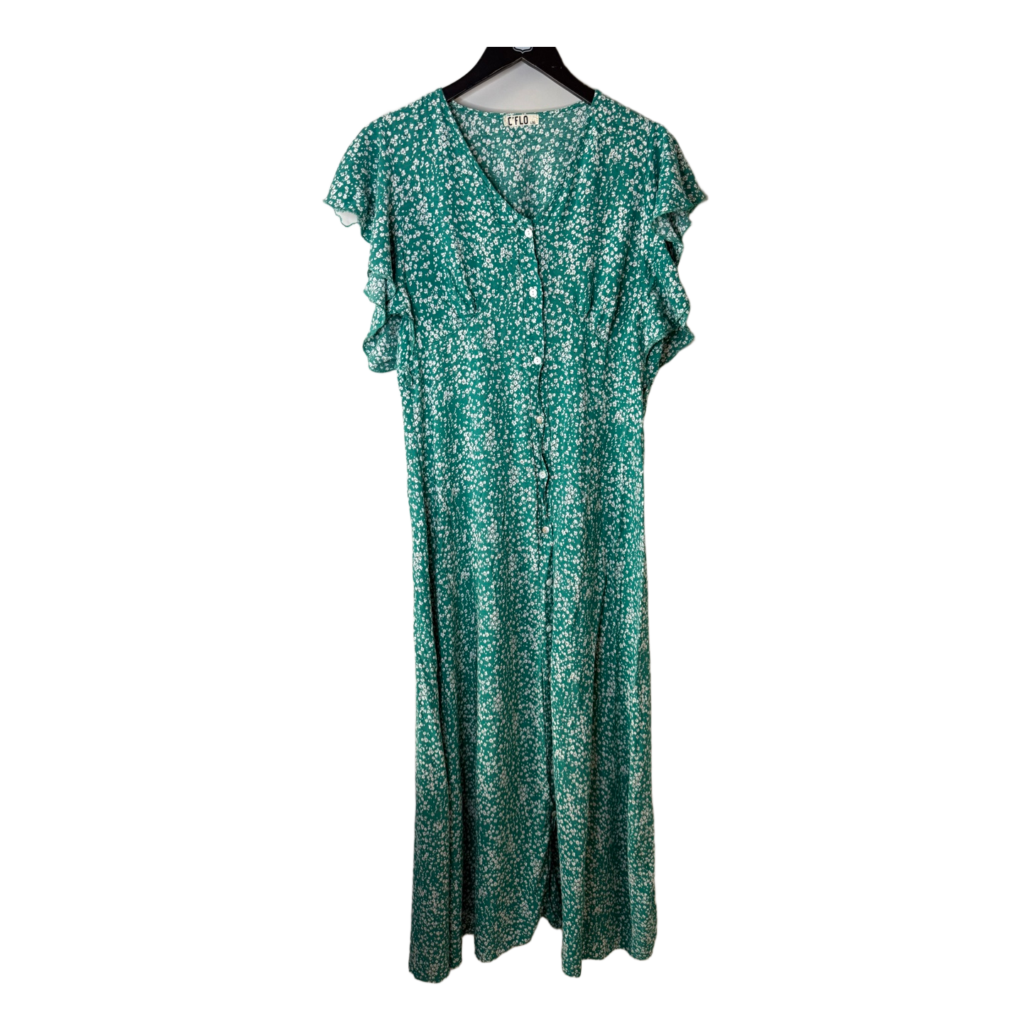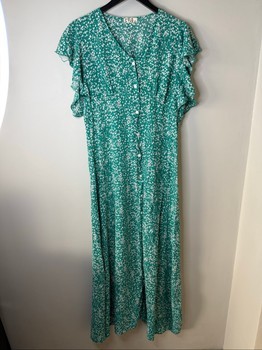 Green midi dress with white floral print, short ruffled sleeves, and button-down front. Size L/XL.