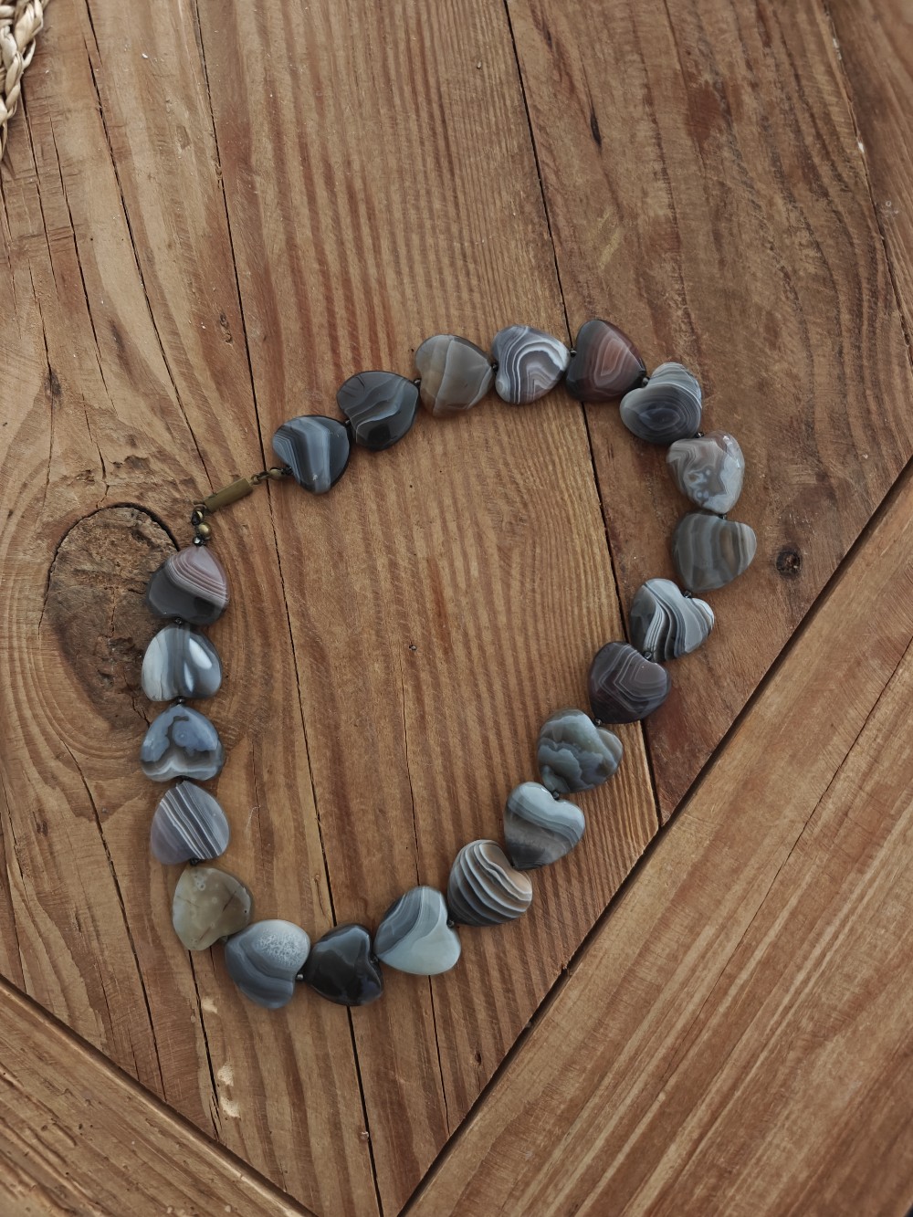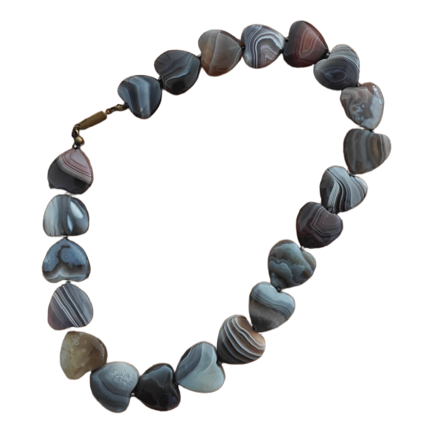 Gray-toned necklace assembled from heart-shaped stones. As far as I understand, the stones are agate.