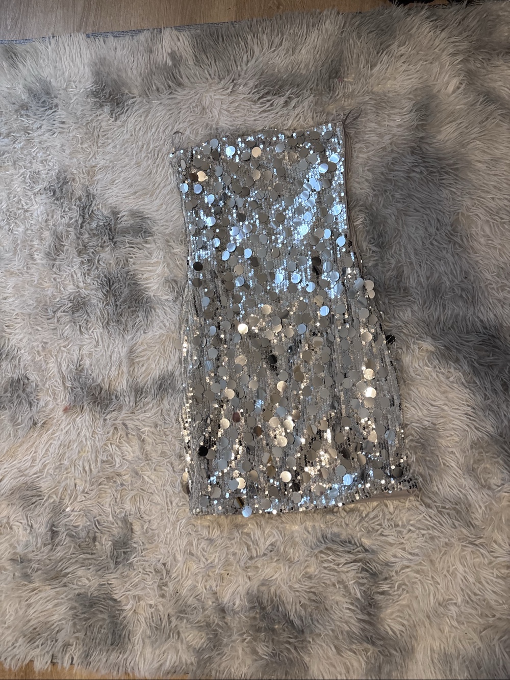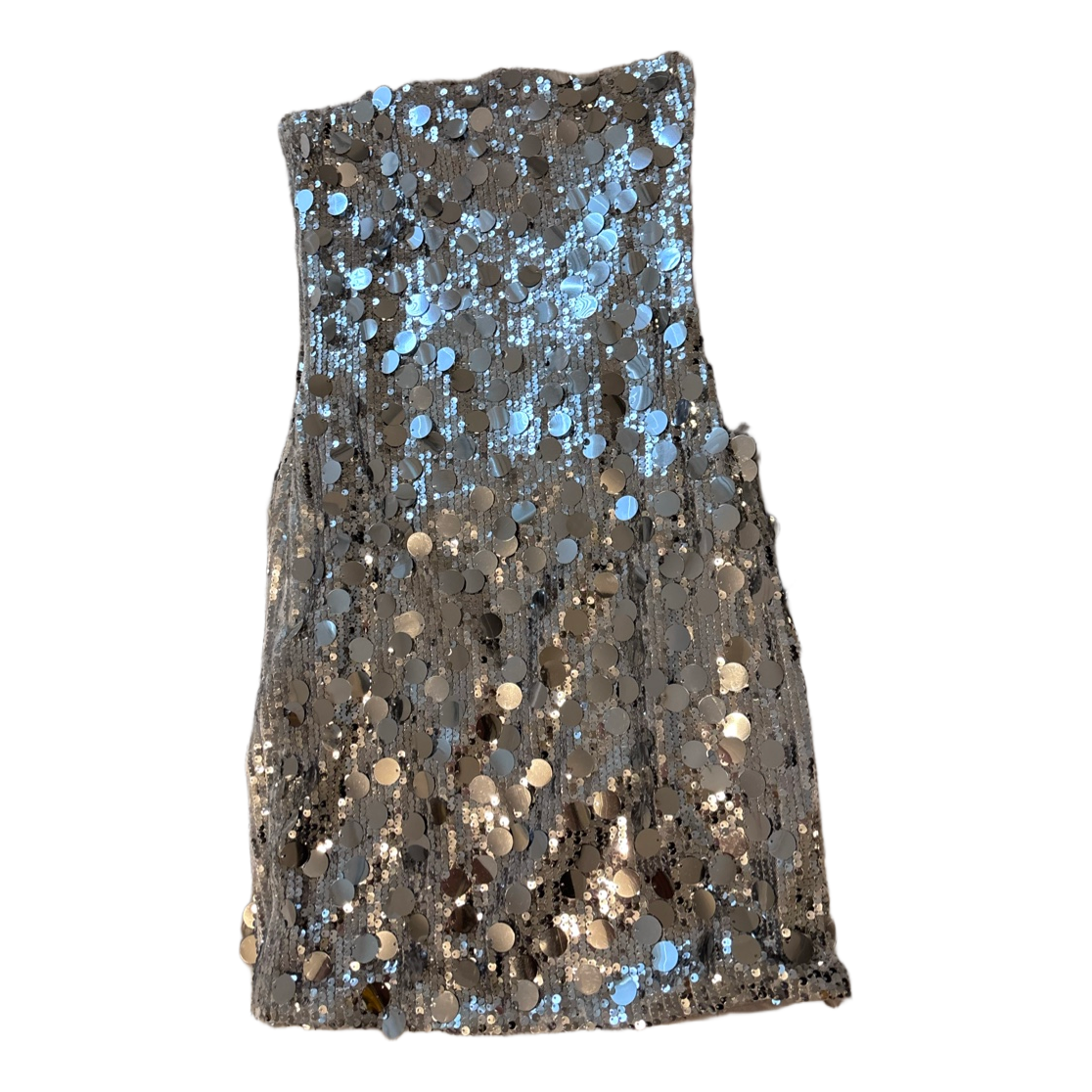 Strapless mini dress covered in large silver sequins.