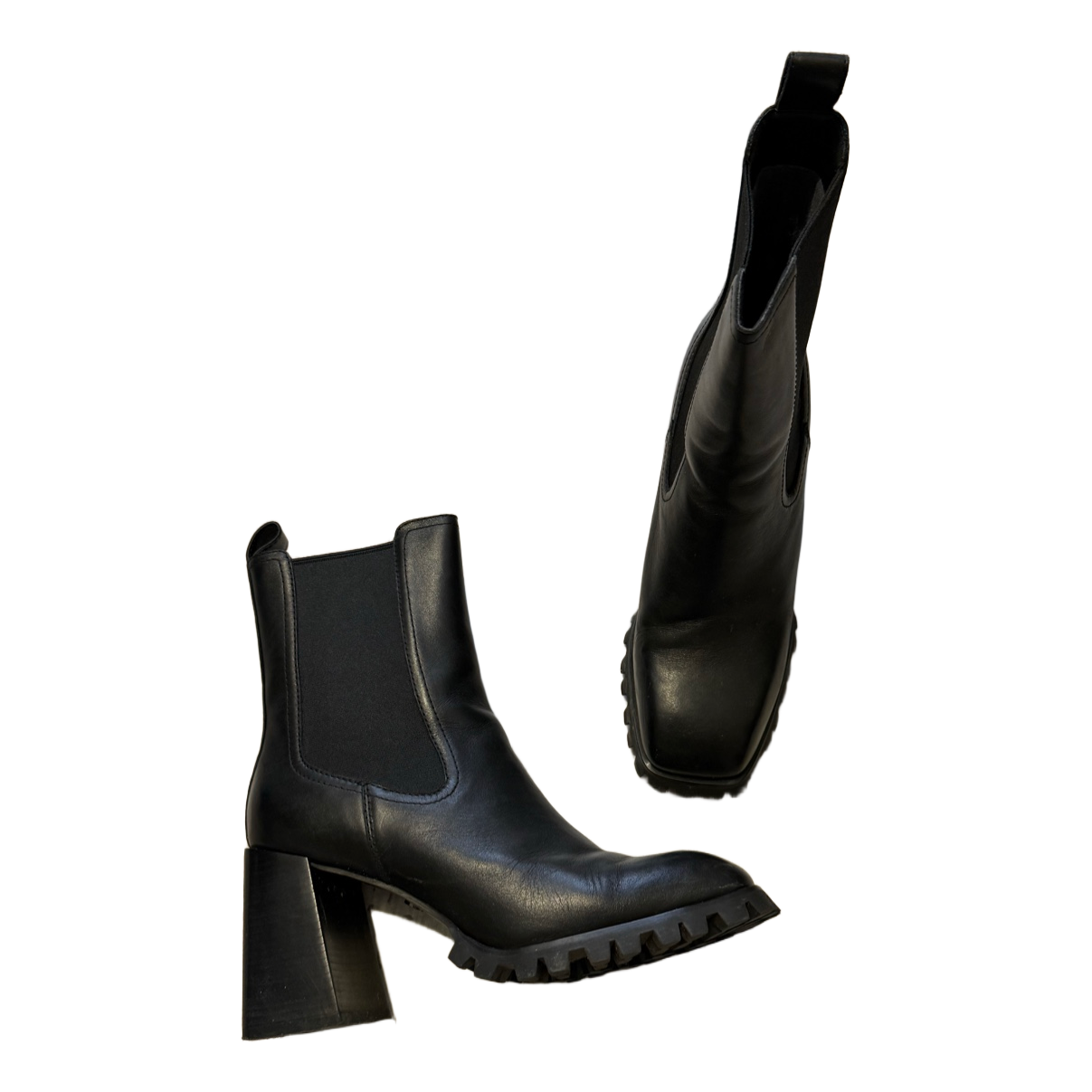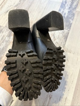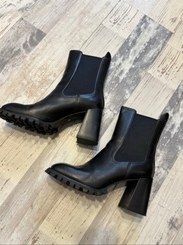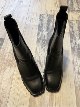 Black leather ankle boots with chunky heels and elastic side panels. Size 37.