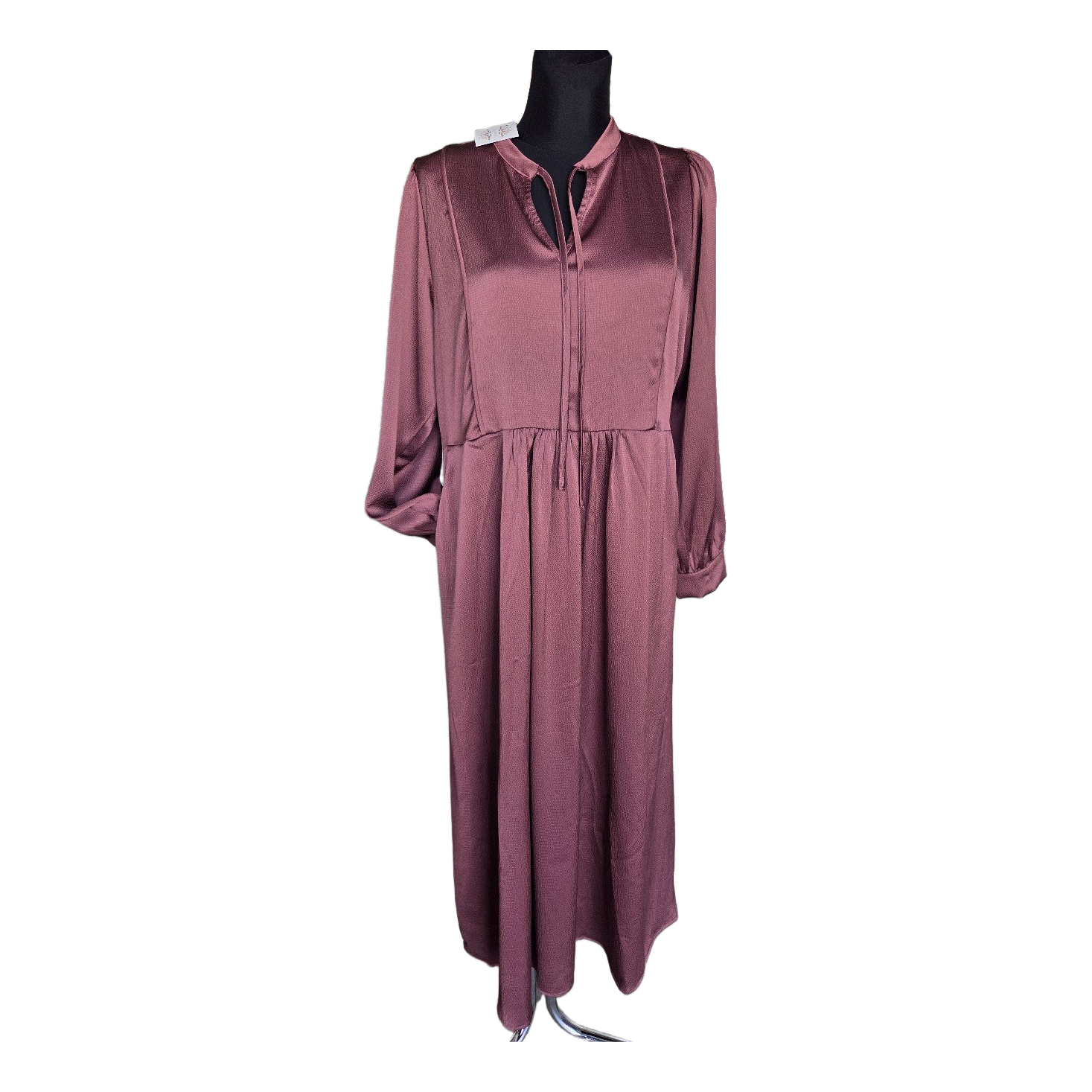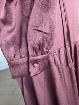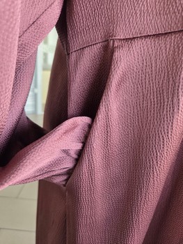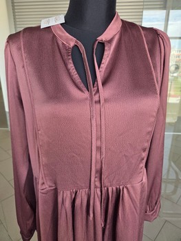 Midi dress in a plum color with long sleeves. Features a v-neckline with ties and side pockets. Size L/XL.
