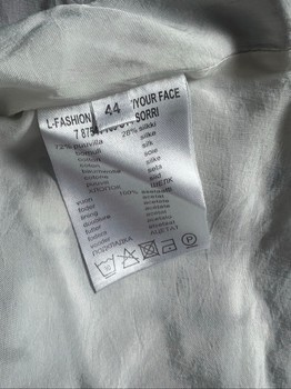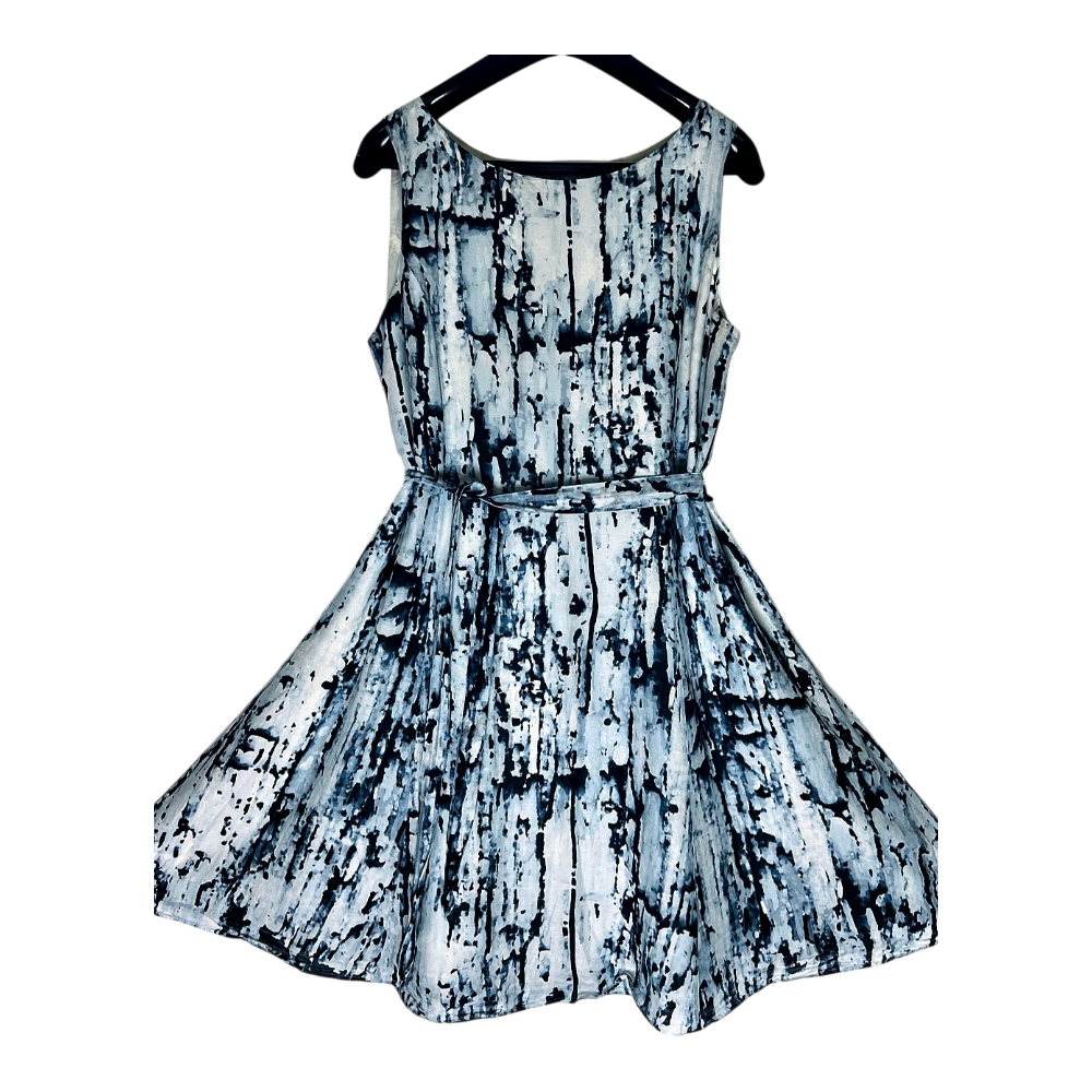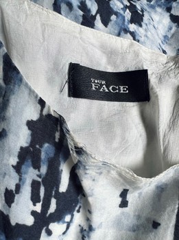 Fitted A-line Your Face dress. Accentuates wonderfully feminine lines. Outer fabric thin and wonderfully soft cotton (72%) and silk (28%), white lining 100% acetate. Note: material does not stretch. Gentle wash 30C. Length from nape to hem 90 cm, shoulder width approx. 37 cm, width at armpit approx. 54 cm, waist width 49 cm, hem width approx. 114 cm. 54 cm zipper at the back. Belt 170 cm. The dress is one of my favorite dresses and has mainly been used as a party dress; signs of use include rather minor yellowing and pilling in places, the seam at the front slit has torn about 5 cm (see photo) but I can neatly repair it almost invisibly before shipping if you wish (message me if you want me to repair). Overall the dress still looks neat and beautiful (unfortunately it no longer fits me).