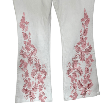 New with tags wide / flare leg jeans with beautiful lace embroidering on the leg hems. Streachy fabric. Pictures have some color destortions that are not on the jeans. Faux-pockets on the front, two back pockets. High rise.
