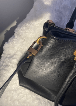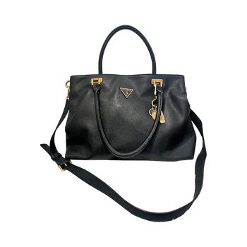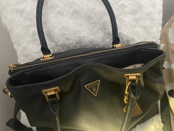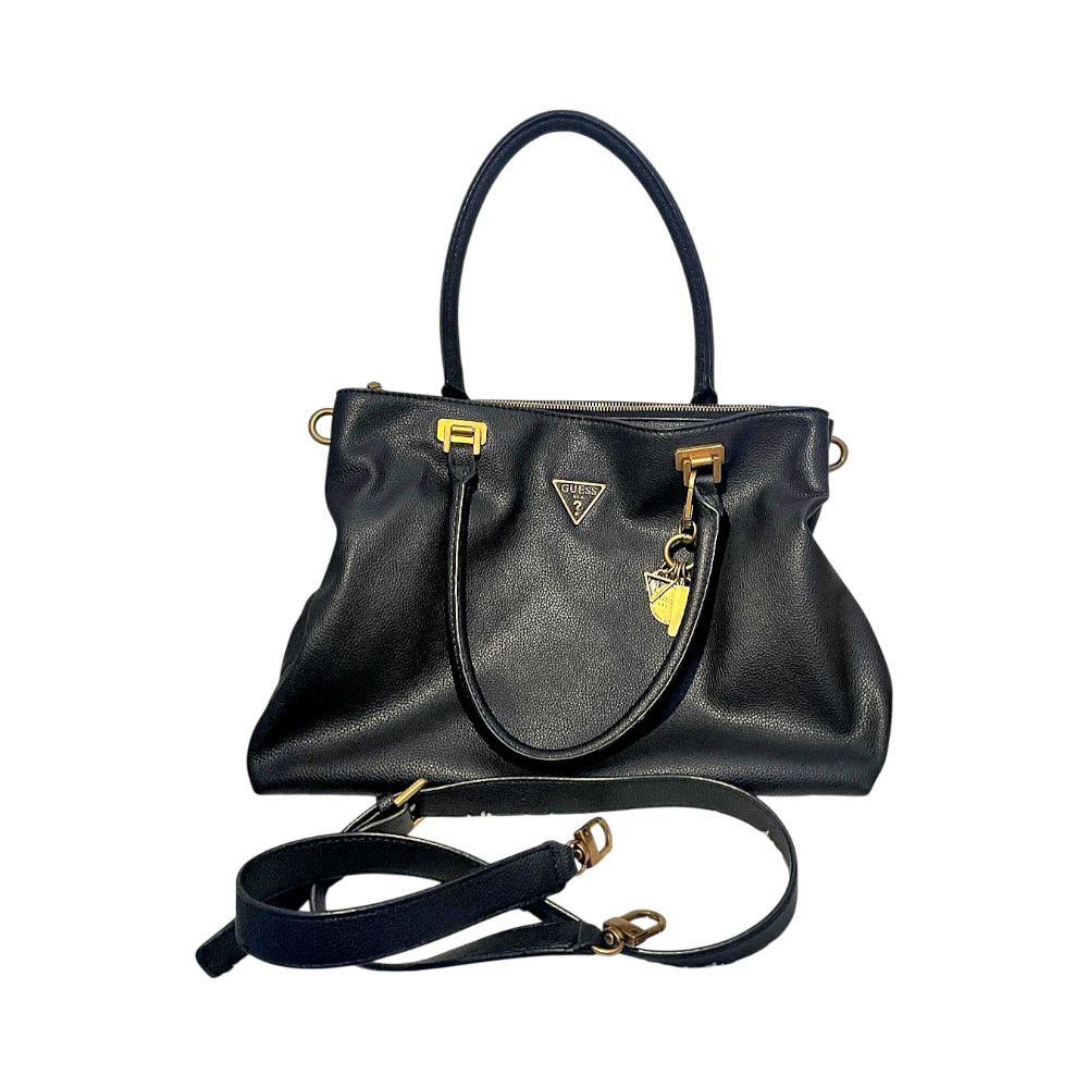 GUESS handbag with gold-colored metal fittings. The bag has a removable and adjustable shoulder strap and top handles. Multiple compartments and zippered pockets, so items stay well organized. Includes the original GUESS logo charm.