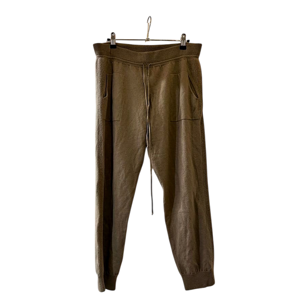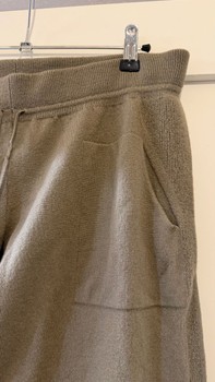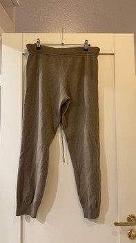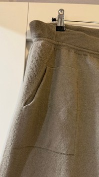 Beige-brown knitted pants merino wool. At the waist a drawstring and at the sides pockets. On the front seam there is a hole, noted in the price. The fabric is intact but the seam has come undone.