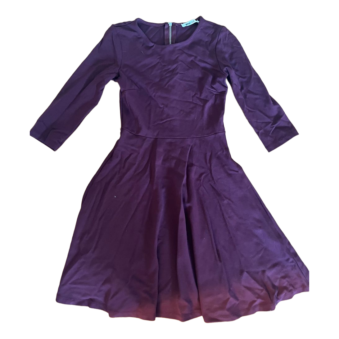 Wine-red 3/4-length long-sleeved dress. Zipper at back.