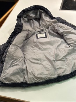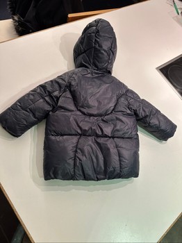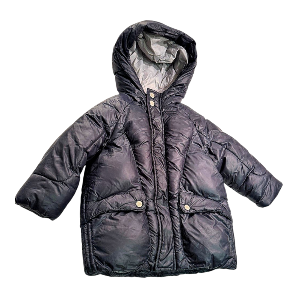 A navy blue padded jacket with a hood for babies. It features snap buttons and two front pockets.