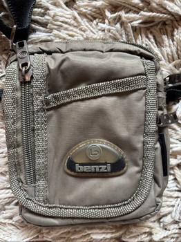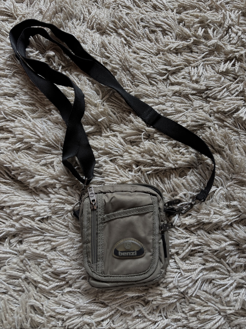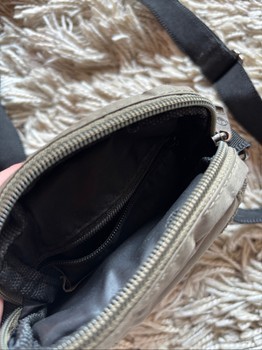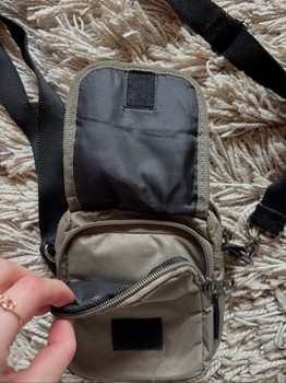 Small khaki crossbody bag with multiple zippered compartments and an adjustable shoulder strap.