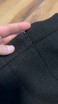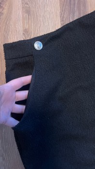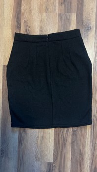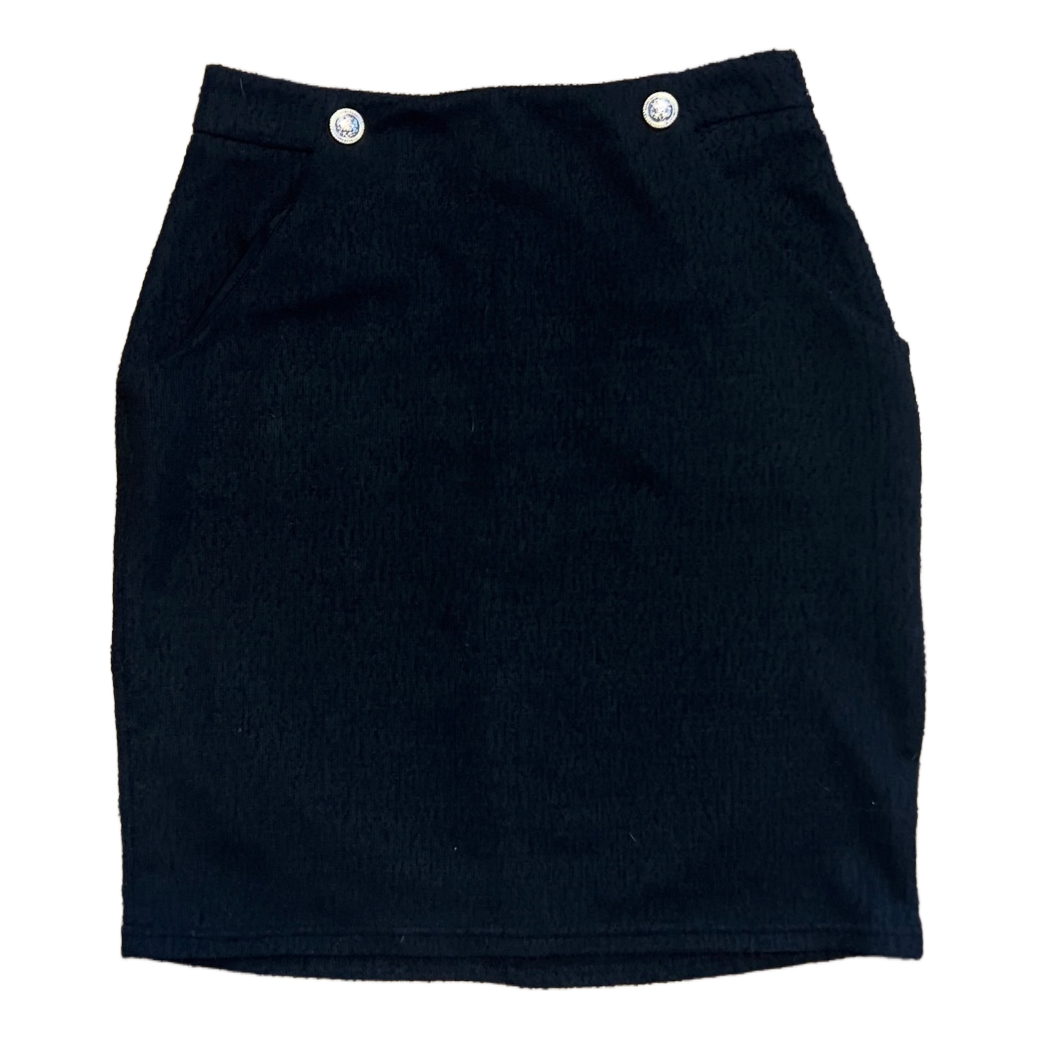 Black textured mini skirt with gold-tone button details at the waist and side pockets. Features a back zipper closure.
