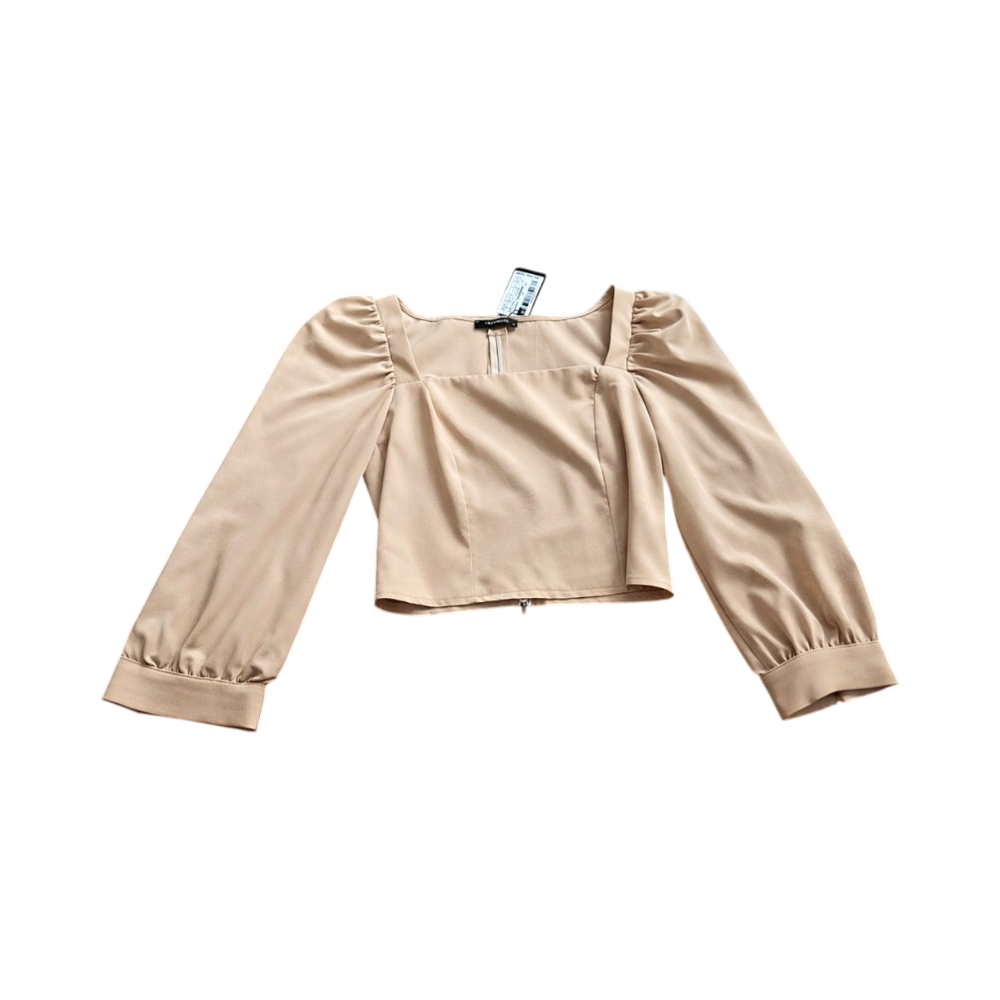 A beige long-sleeve top from Fashion Nova. It features a square neckline and puffed shoulders. The top has long sleeves with cuffs and a cropped hem.