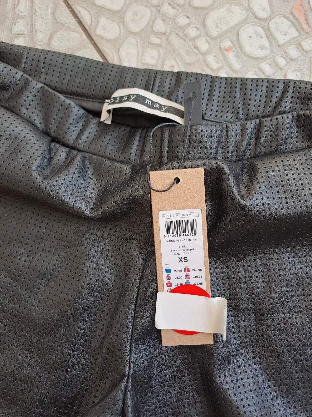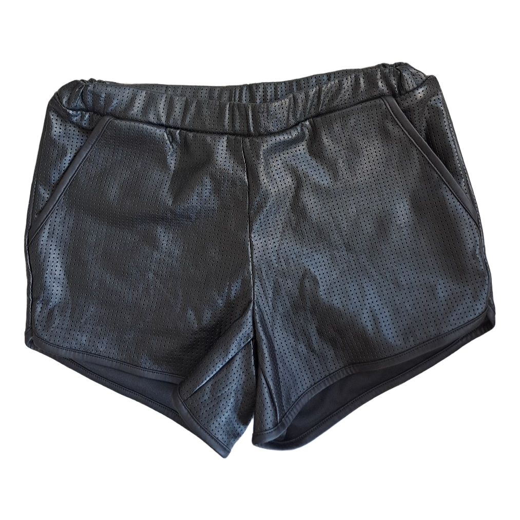 Black shorts in perforated faux leather material. Elasticated waistband and side pockets. New with tags, size XS.