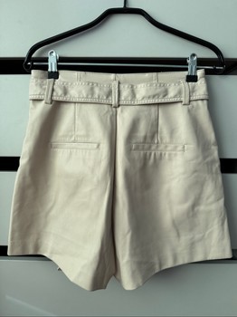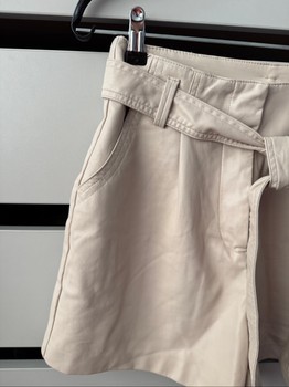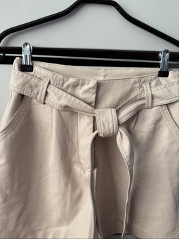 Beige faux leather shorts with a tie belt and side pockets. Size 38.