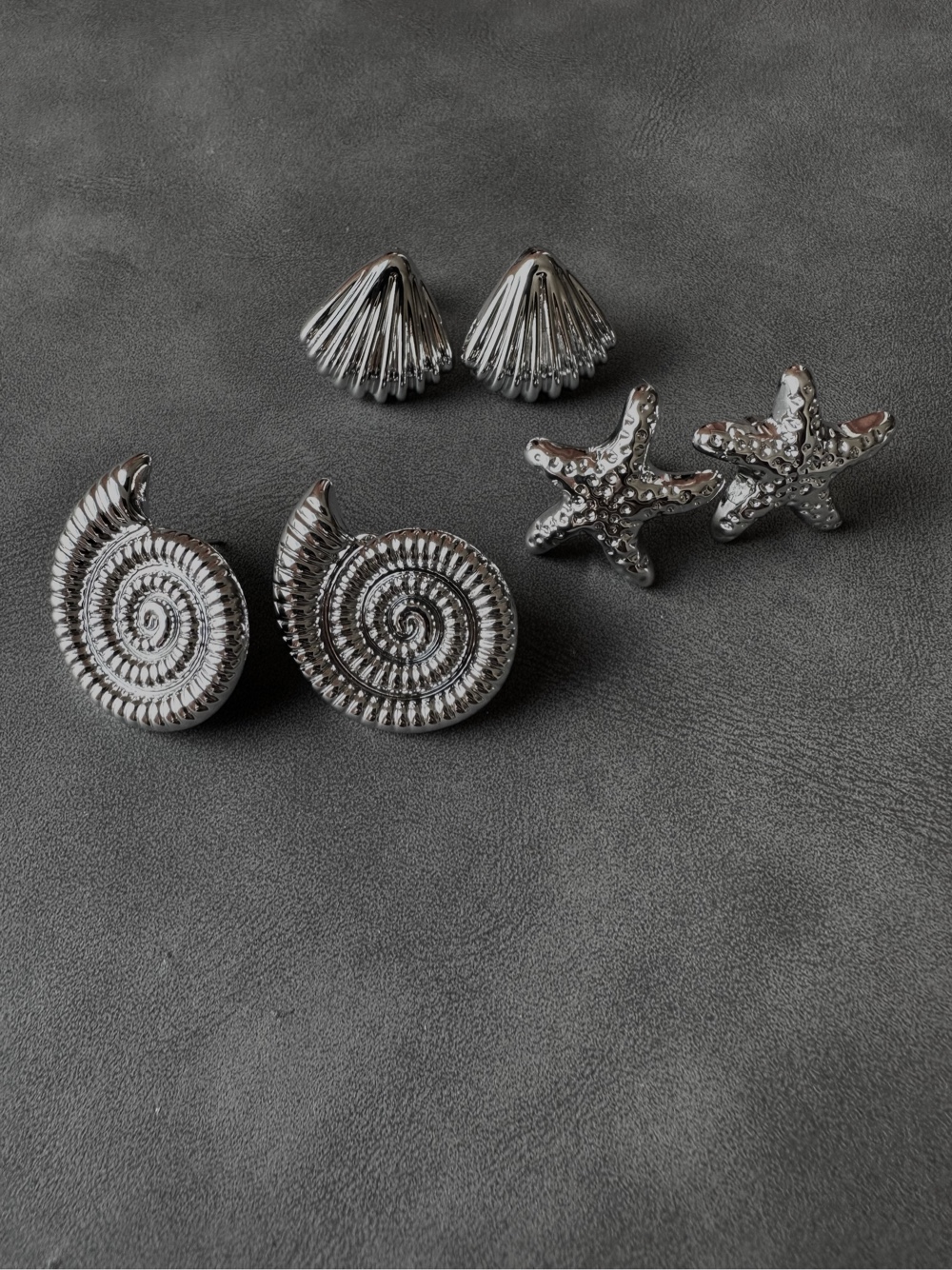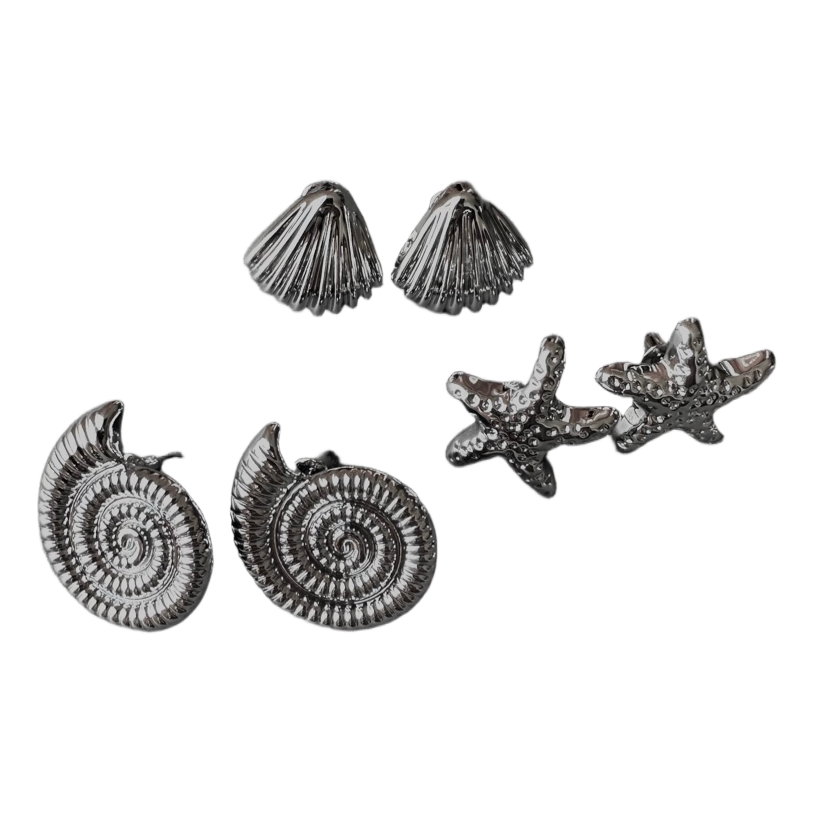 Set of three pairs of silver-toned stud earrings featuring shell, spiral, and starfish designs. They are very lightweight!
